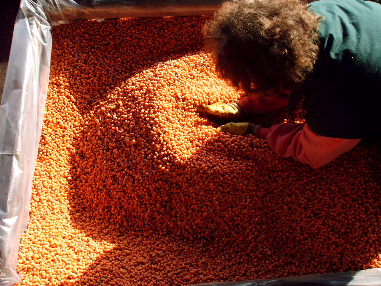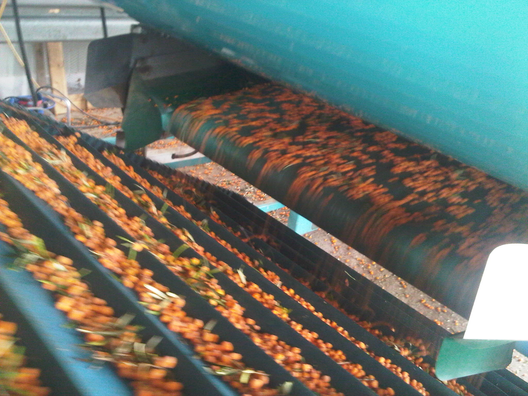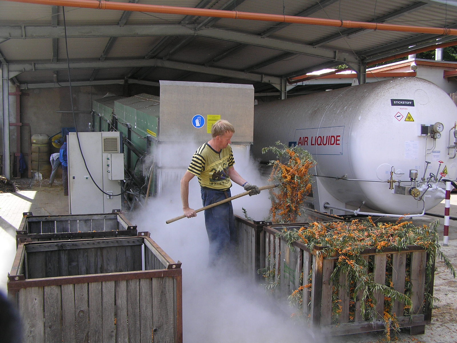 Die Frostung bewirkt ein leichtes Ablösen der Früchte beim Rütteln und verhindert das Aufplatzen der Früchte. Durch eine schnelle Tiefkühlung, z.B. unter Verwendung von Flüssigstickstoff, bleibt die Fruchtqualität weitgehend erhalten. Die Früchte werden bei Temperaturen von unter -18°C mittels Vibrationen von den Fruchtästen getrennt und anschließend gereinigt sowie eingelagert. So entsteht tiefgefrorene „rollende Ware“ für die Weiterverarbeitung.