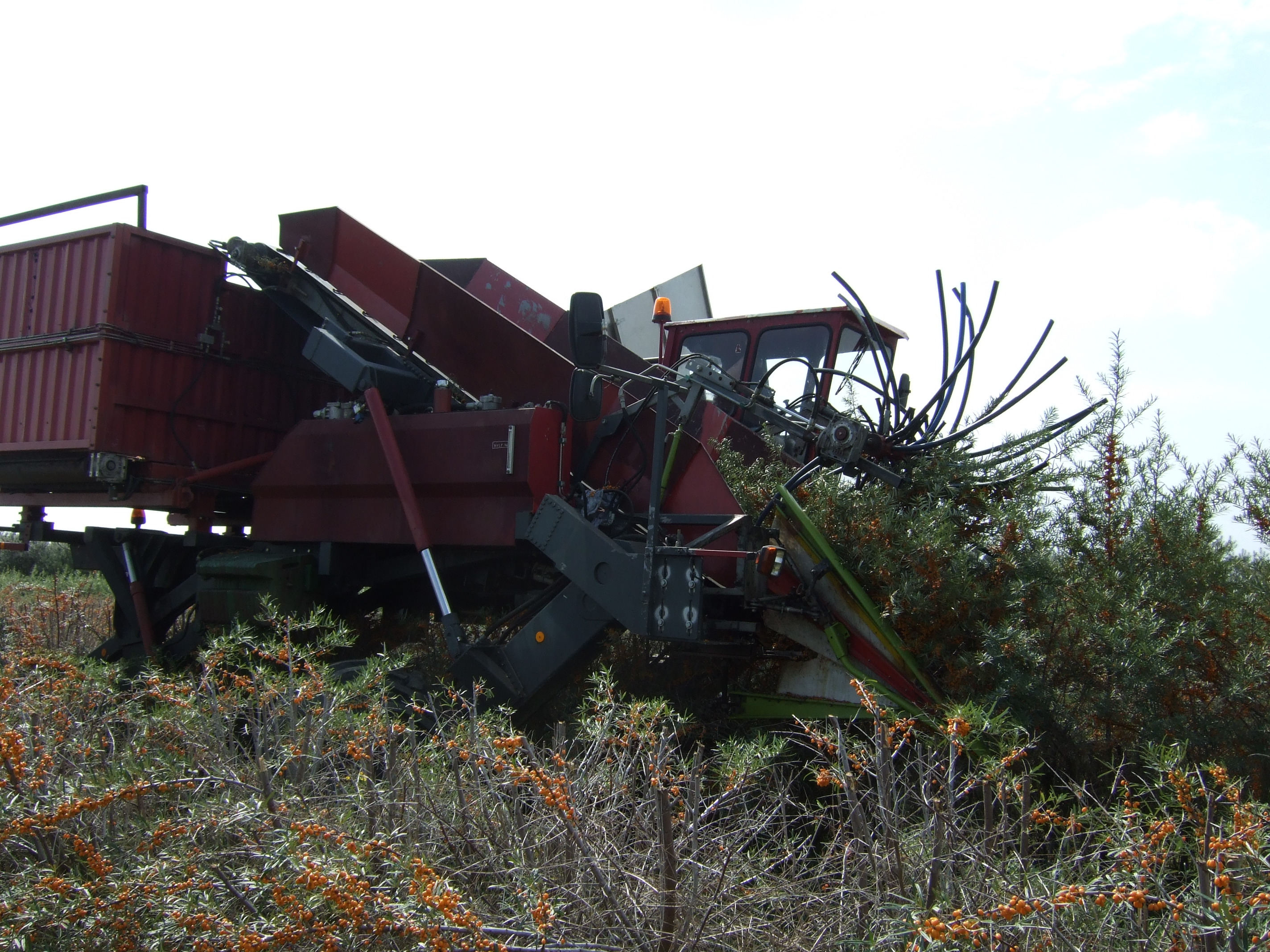 Aufgrund der hohen Fruchthaltekräfte und der Gefahr des Aufplatzens ist ein Abschütteln der Früchte direkt am Strauch kaum möglich. Daher hat sich in Deutschland das Schnitternteverfahren in Kombination mit der Frostung durchgesetzt. Üblicherweise werden zweijährige Fruchtäste auf dem Feld mit pneumatischen oder elektrischen Scheren geschnitten und in Großkisten verladen. Diese werden in Tiefkühllager gebracht. Für größere Betriebe wurde eine selbstfahrende Erntemaschine entwickelt. Sie ist hydraulisch höhenverstellbar und überfährt die Strauchreihen. Seitlich angebrachte Torpedos führen die Fruchtäste der Schneideinrichtung zu. Eine Haspel sorgt für die gerichtete Ablage des Schnittgutes auf den Höhenförderer, der die Fruchtäste zum Vorratsbunker führt. Diese können im Anschluss mittels Überladeband auf Transportanhänger überführt werden. Mit der Sanddornerntemaschine werden Schnittleistungen von 0,5 ha/h erreicht, so dass bei 30 Erntetagen rund 150 ha pro Saison geerntet werden können.